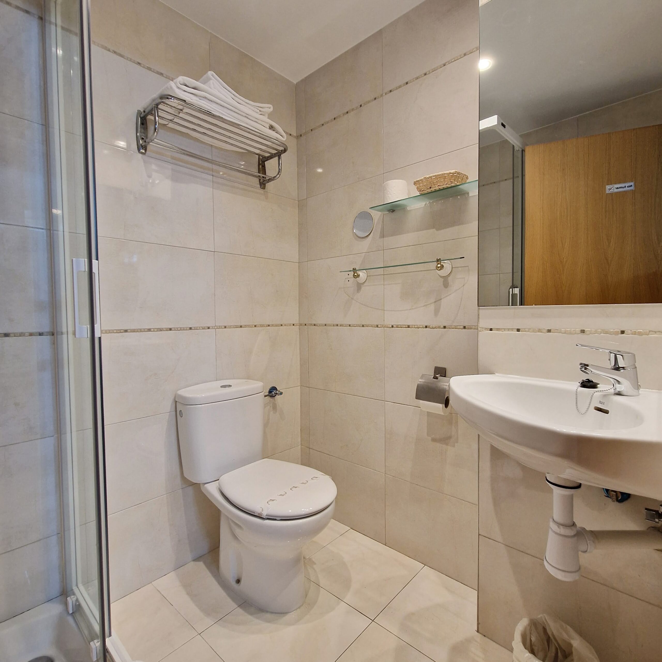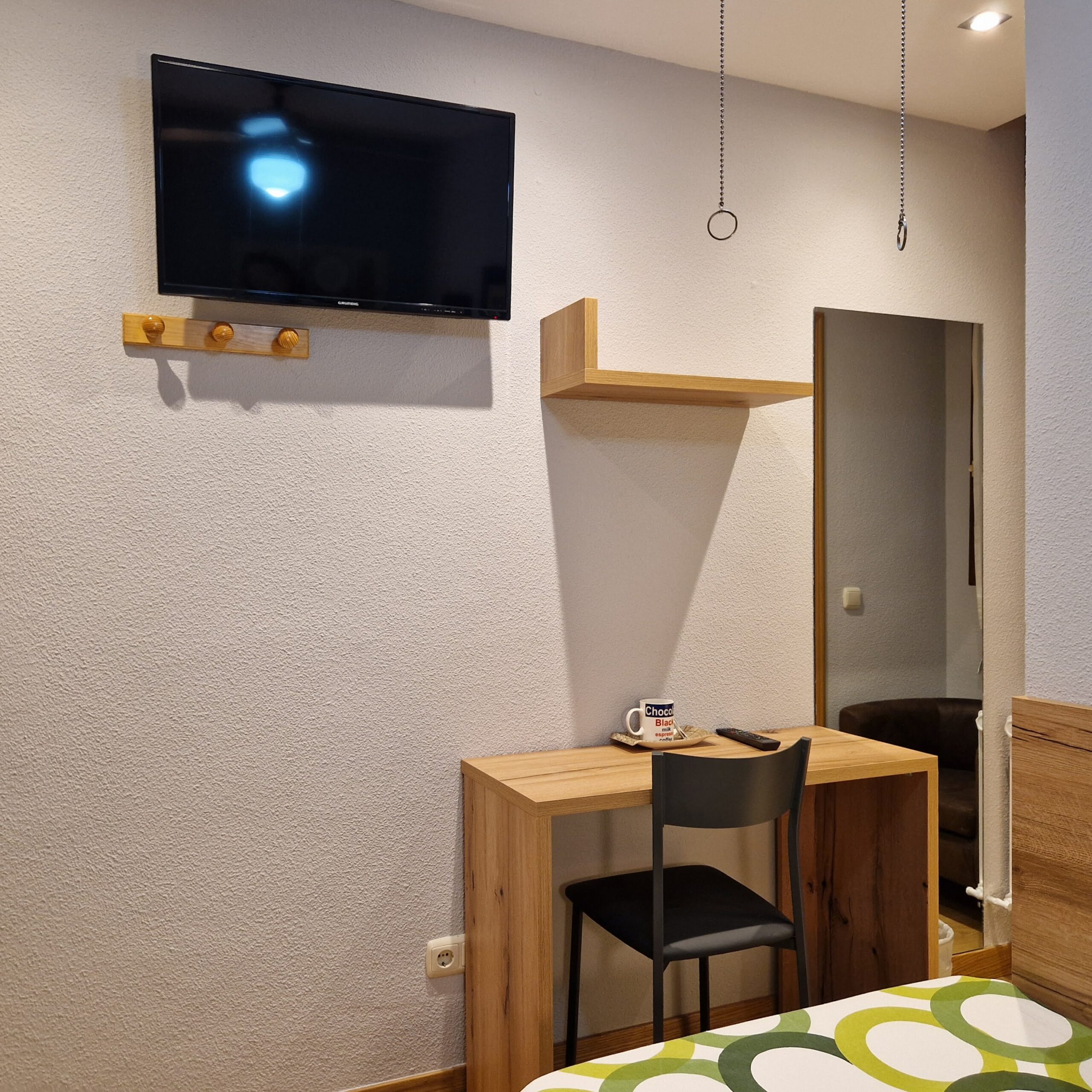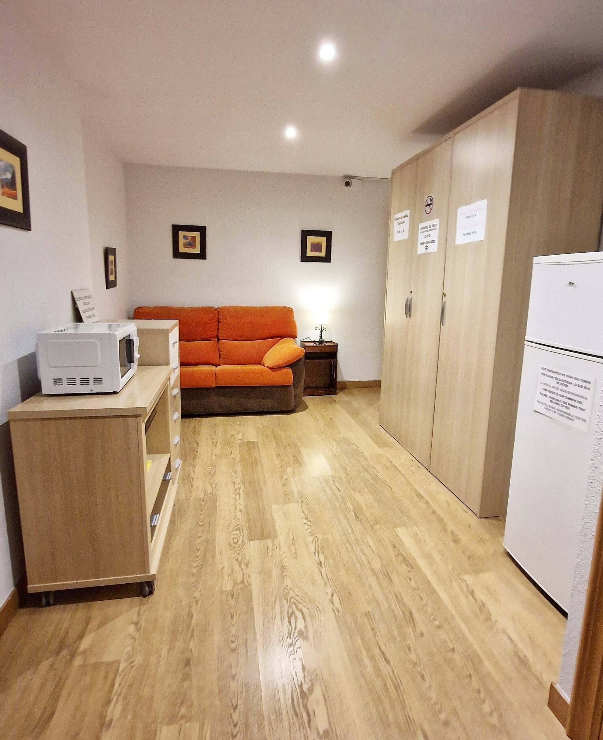 Consta de una cama individual , mesa escritorio, butaca, armario, cómoda, silla, TV, wifi, ventana orientada hacia un patio interior y cuarto de baño con plato de ducha. Algunas tienen acceso a cocina completa (excepto lavadora ) y otras a cocina limitada.